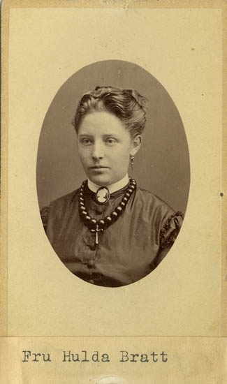 Text på kortets baksida: "Fru Hulda Bratt. Född Svensson".