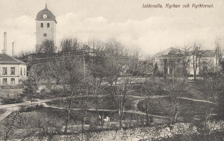 Tryckt text på kortet: "Uddevalla, Kyrkan och Kyrktornet."