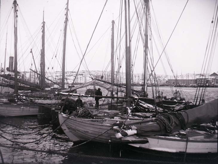 "Bohuslän, Skärgården, Marstrand, Sillbåtar. I hamnen under vinterfisket efter sill".