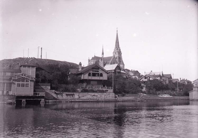 Enligt text som medföljde bilden: "Prof. Curmans villa o. kyrkan från sjön."