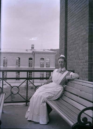 Sjuksköterska sitter utomhus på en bänk på en balkong