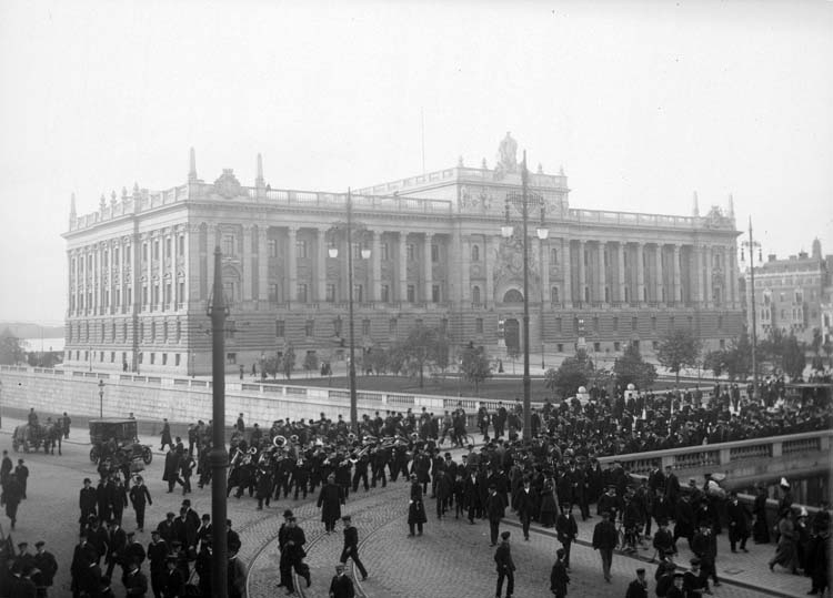Enligt text som medföljde bilden: "Stockholm, Riksdagshuset o. vaktparaden okt. 11".