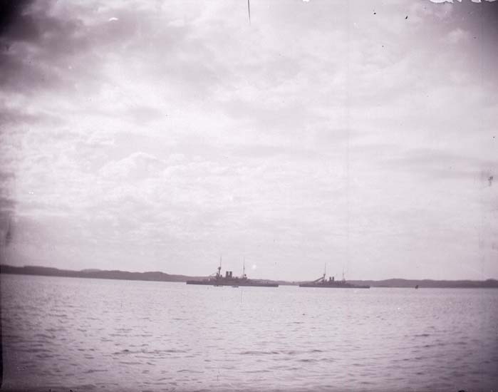 Enligt text som medföljde bilden: "Svenska pansarfartygen "Niord o Thor" fr. Lyckes brygga 24/8 1899 Lysekil".