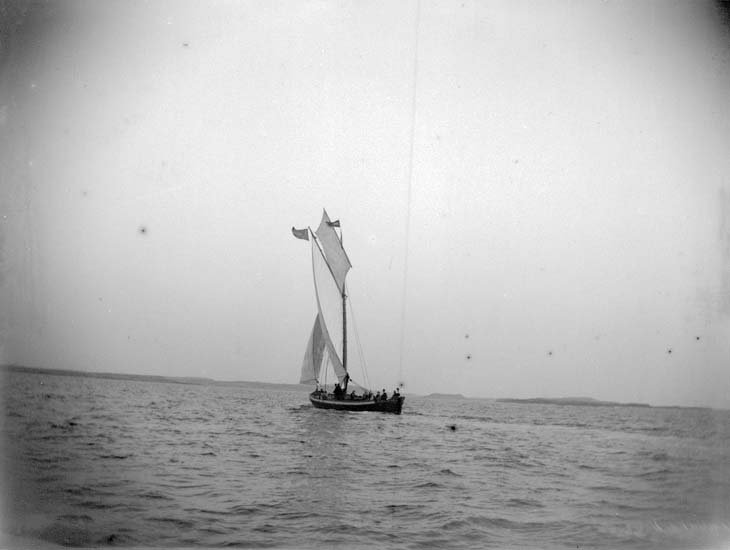 Enligt text som medföljde bilden: "Vid Jäfven. En badgästbåt (länsande) i öppna sjön