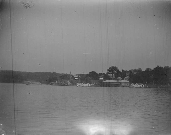 Enligt text som medföljde bilden: "Gustafsberg. Badorten från sjön 1897."