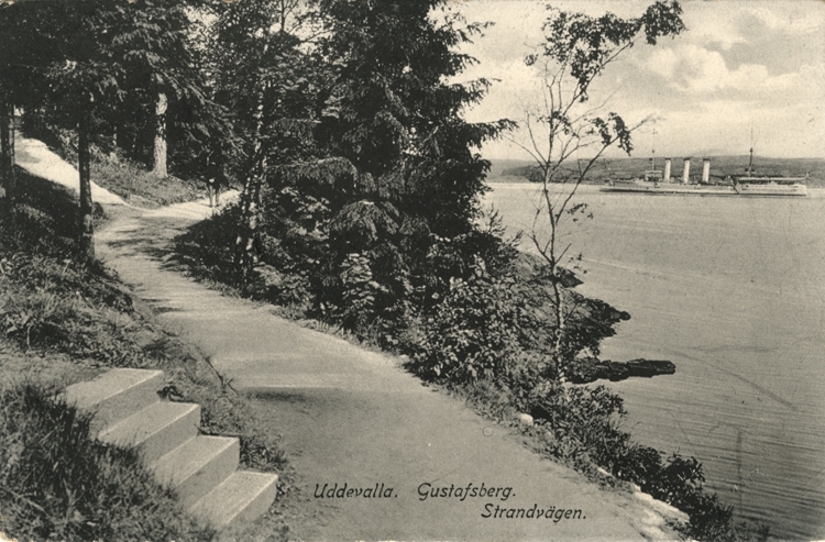 Tryckt text på vykortets framsida: "Uddevalla. Gustafsberg. Strandvägen."