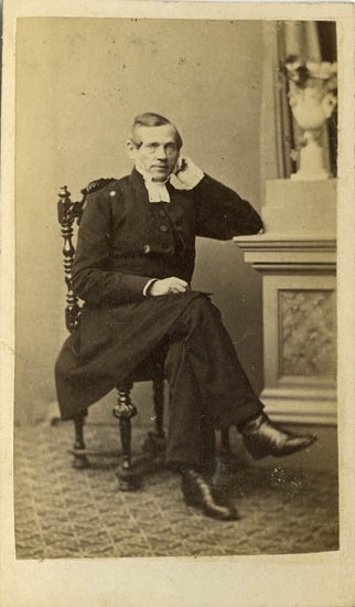 Text på kortets baksida: "Peter Forsberg, f. 1818 d. 1882. Lärare vid Lancasterskolan, Uddevalla. Vid sin död kyrkoherde i Onsala. Vid skolan i U-a 1848 1866".