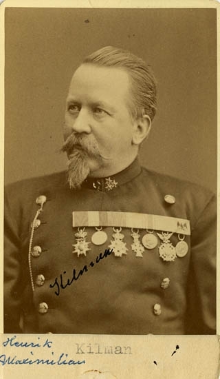 Text på kortets baksida: "Major Henrik Maximilian Kilman, f. 1833. Major o chef för Kongl. Hallands bataljon. Tidigare löjtnant vid Boh. reg".