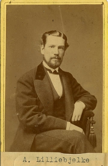 Text på kortets baksida: "Handelsresanden August Lilljebjelke, f. 29/6 1844 d. i Westerås 10/10 1909. G. m. Cornelia Bollt Christmas".