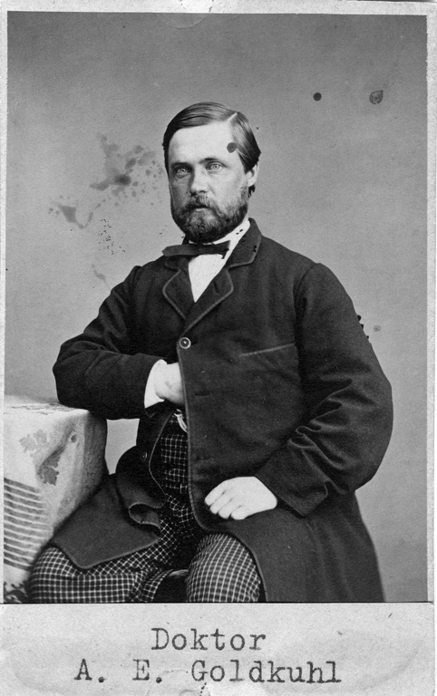Text på kortets baksida: "Provincialläkaren Dr, August Edvard Goldkuhl. F. 1983 Sandklef. Utn. 1869 till läkare vid Kronob. Läns Laz Wäxsjö".