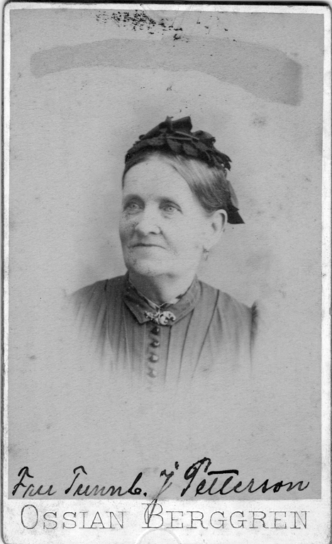 Text på kortets baksida: "Fru Charlotta Pettersson f. Hedström. F. 9/7 1824 d. 27/6 1908. Maka till tunnbindarmäst. J. Chr. Pettersson".