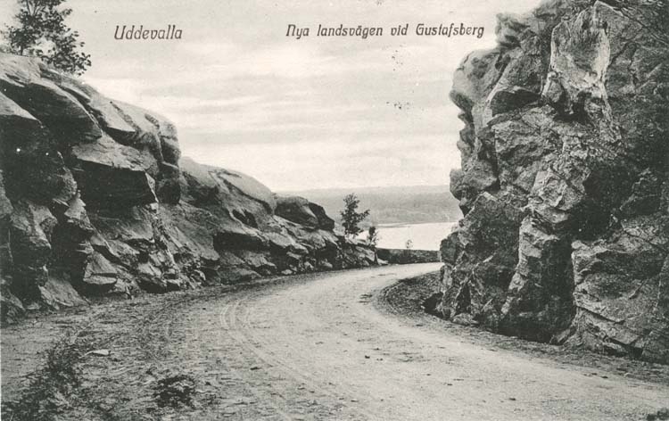Tryckt text på vykortets framsida: "Uddevalla, Nya landsvägen till Gustafsberg."