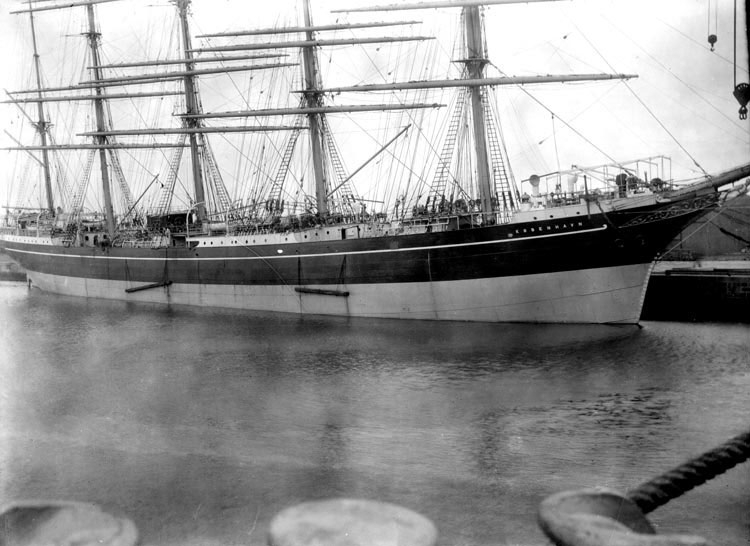 "Barken Köpenhamn i hamnen. Till sjöss, 1921."