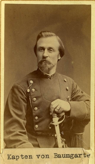 Text på kortets baksida: "Thure Reinhold Leonard von Baumgarten. Kapten. Gymnastiklärare vid läroanstalten i U-a 1884-1909".
