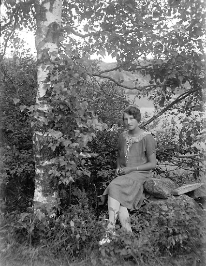Enligt notering: "Ung kvinna på gärdesgård, Ester Hansson, Skistad".