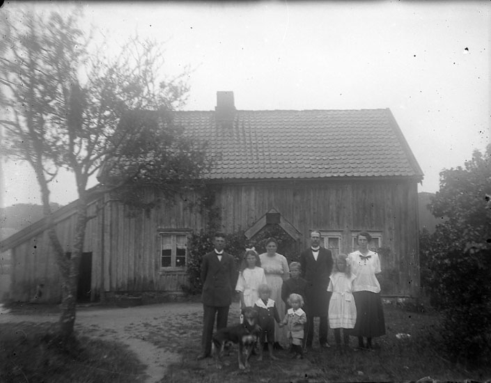 Enligt notering: "Grupporträtt framför hus. Trättestad 1 aug. 1921, Hans Göranssons familj".