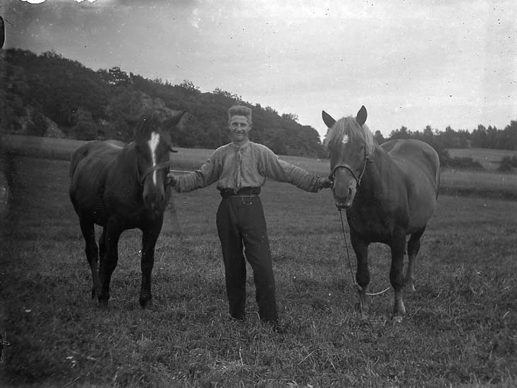 Enligt notering: "Med hästarna i hagen. Karl-Otto Karlsson, Skistad Norgård".