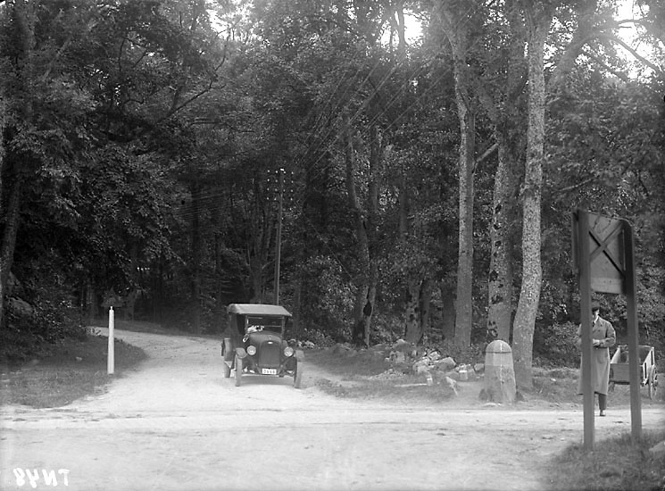 Enligt senare noteringar: "Höjentorp vid vägkorset vid Kristinedal, Gustafsberg. Från söder kommande bil, troligen Chevrolet."