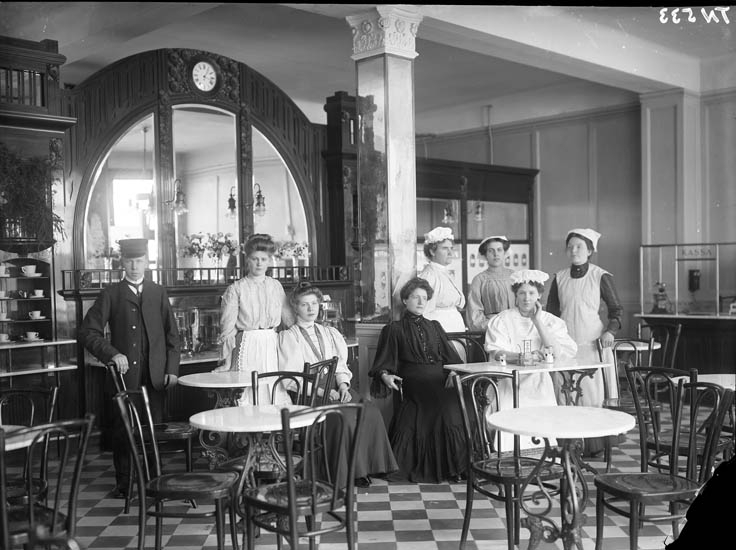 Enligt tidigare noteringar: "Interiör från serveringslokalen "Automaten" Kungsgatan Uddevalla. Gruppbild på personalen."
