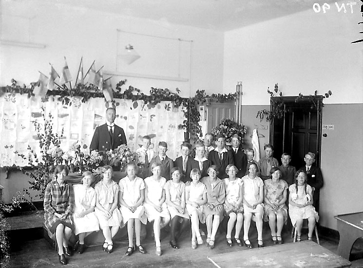 "Klassrum, smyckat inför examen. Lärare och elever. Magister Börjessons klass. Uddevalla Folkskola vid Margretegärde."
