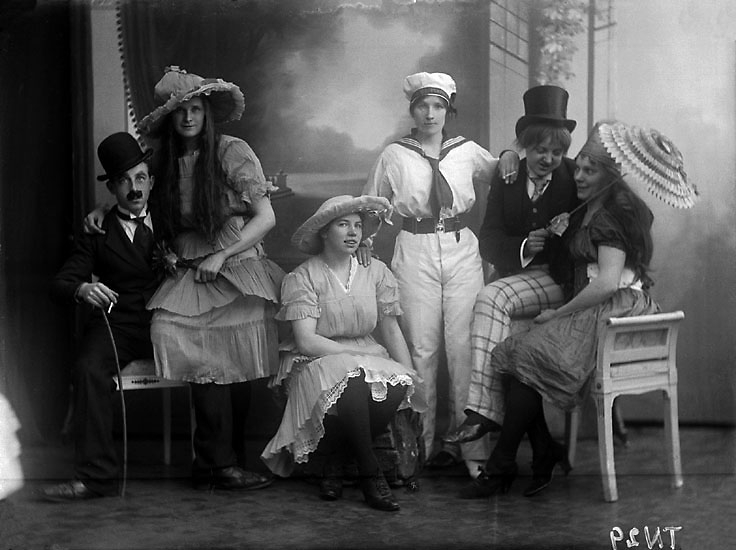 Enligt senare noteringar: "Ateljéfoto av grupp av skådespelare, utklädda i olika rolldräkter, maskeraddräkter."