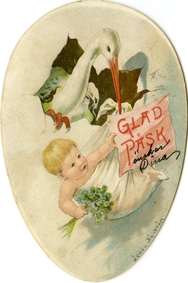 "Glad Påsk önskar Dina". Påskkort i form av ett ägg med en stork och baby.