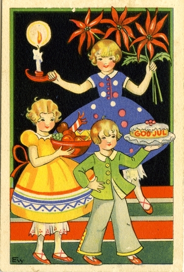 Kort: "God Jul". Barn som kommer med tårta, frukt och blommor.