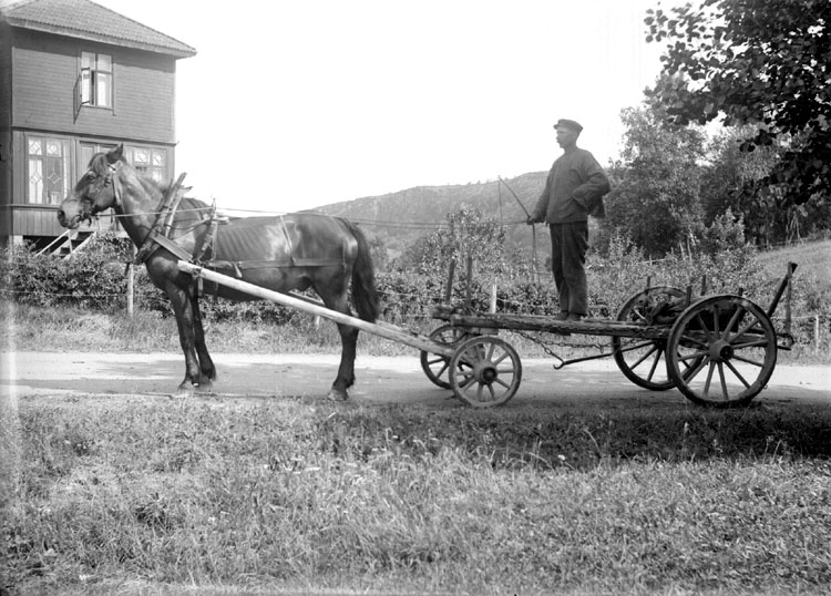 Enligt senare noteringar: "Timmerkörare med häst och vagn utanför Oscar Färdigs hus." (BJ)