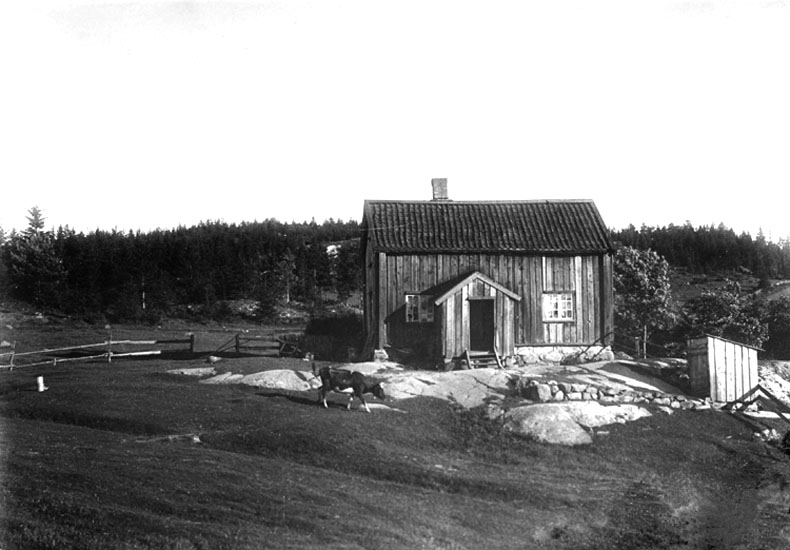 Enligt senare noteringar: "Torpställe med gammal stuga, byggd troligen i början av 1800-talet, någonstans i Foss. Repro efter gammalt foto." (BJ)