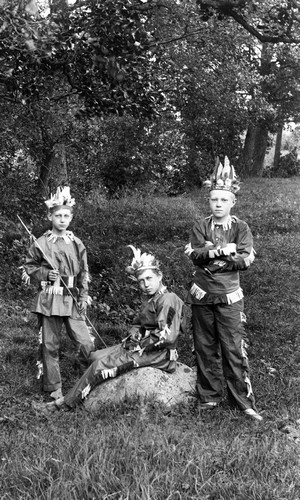 Tre utklädda pojkar i Munkedal sommaren 1915