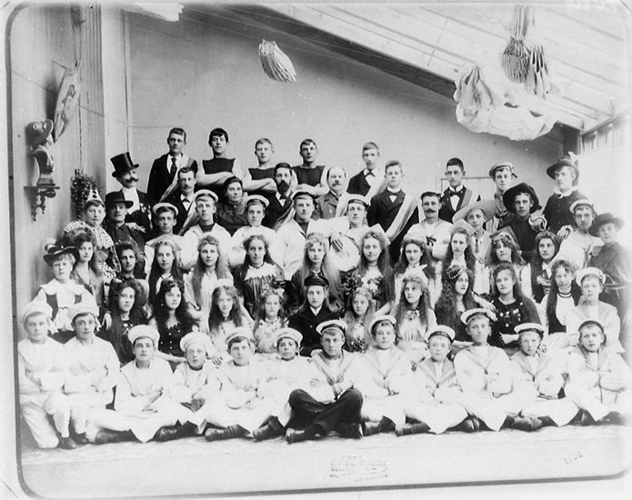 Enligt tidigare noteringar: "Avfotografering av ateljéfoto av A. Hansson 1902 av medlemmar i nykterhetsloge, klädda till kostymfest. Samma ateljé som T. Nihlén övertog 1906."