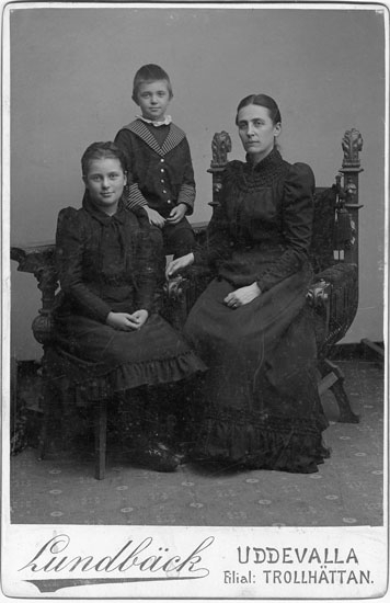 Enligt text skrivet på kopian: "Fru Hulda Agrell med barnen Ingrid & Nils".