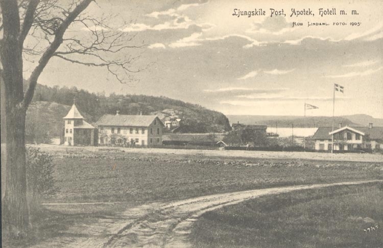 Tryckt text på kortet: "Ljungskile. Post, Apotek, Hotell mm.".