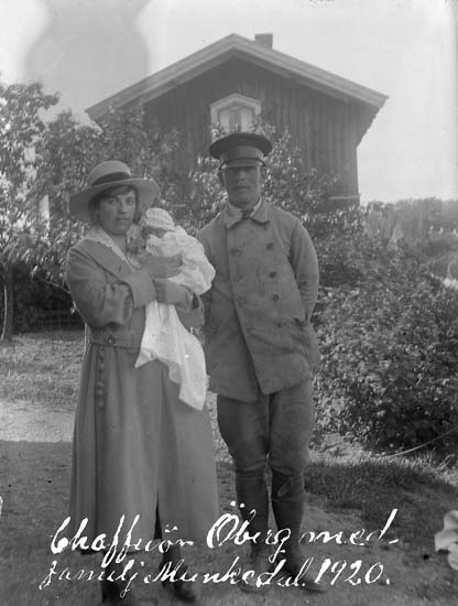Enligt text skriven på glasplåten: "Chaufför Öberg med familj. Munkedal 1920."