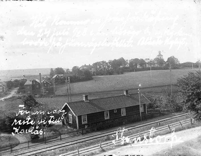 Enligt text på fotot: "Hit kommer vi från Jönköping den 24 juli 1/2 8 e.m. besågo bl.a. kyrkan bodde på Järnvägshotellet. Blåste kyligt. Följande dag reste vi till Kavlås. Stenstorp".