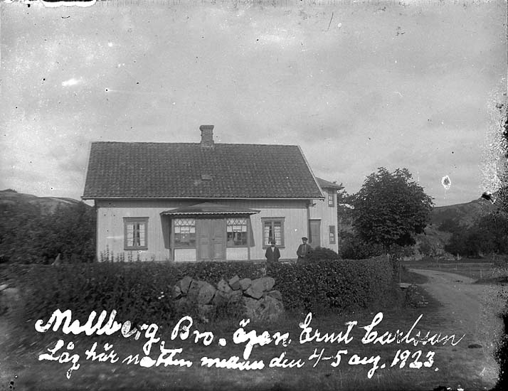 Enligt text på fotot: "Mellberg Bro, ägare Ernst Carlsson. Låg här natten mellan den 4-5 aug. 1923",