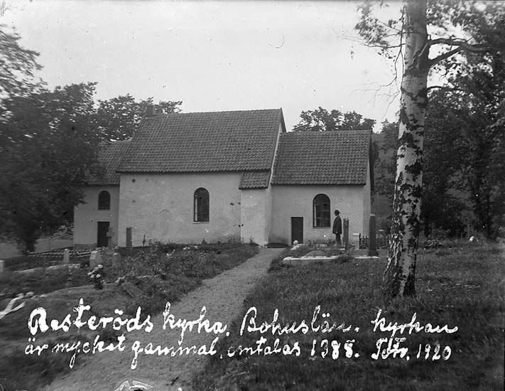 Enligt text på fotot: "Resteröds kyrka, Bohuslän, kyrkan är mycket gammal, omtalas 1388. Foto 1920".