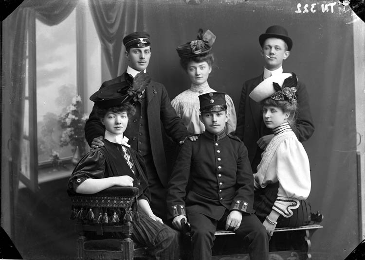 Enligt senare noteringar: "Ateljéfoto av ungdomar tre män tre kvinnor i olika klädsel, en man i uniform, samtliga med huvudbonader."