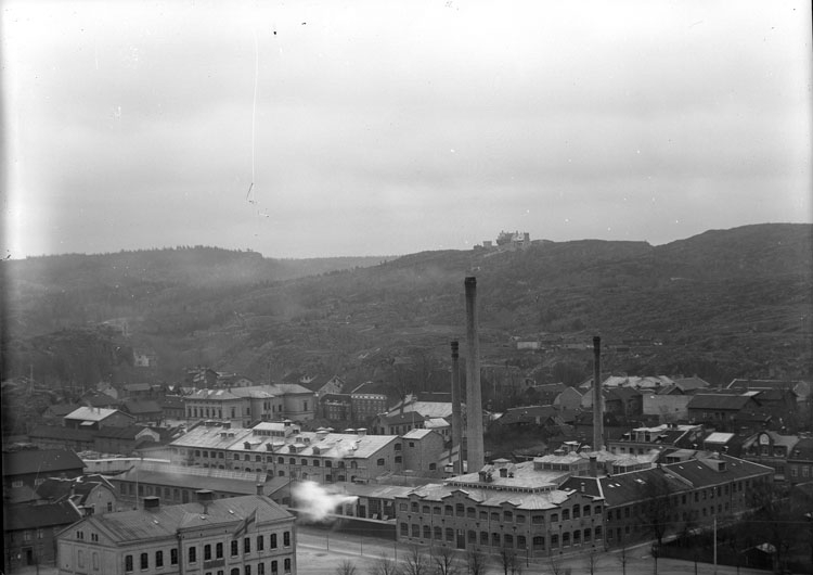 Enligt tidigare noteringar: "Vy över Uddevalla. Tändsticksfabriken från Kålgårdsberget.
