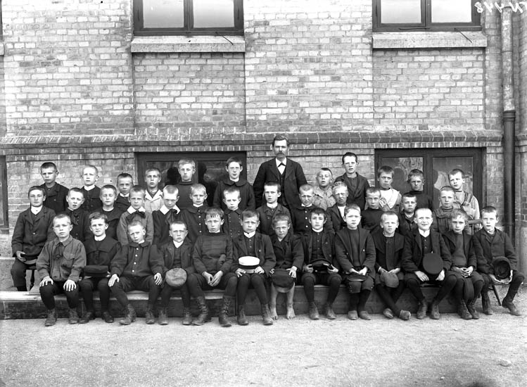 Enligt tidigare noteringar: "Skolklass med lärare framför folkskolan Margretegärde Uddevalla."
