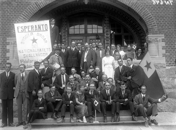 Enligt tidigare noteringar: "Gruppbild på trappan till Flickskolan Uddevalla. Sammankomst vid Esperantodagar i Uddevalla."