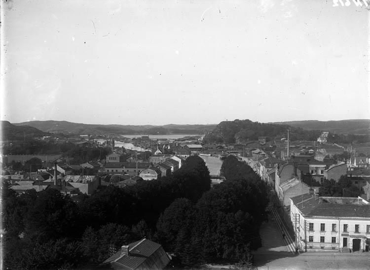 Enligt tidigare noteringar: "Utsikt från Klocktornsberget mot väster över Bäveån. Hamngatorna, hamnen o del av staden."