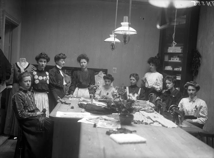 Enligt tidigare noteringar: "Gruppfoto i syateljé av 9 damer i fina kläder "sömnadskurs" 3 symaskiner, 2 gaslampor."