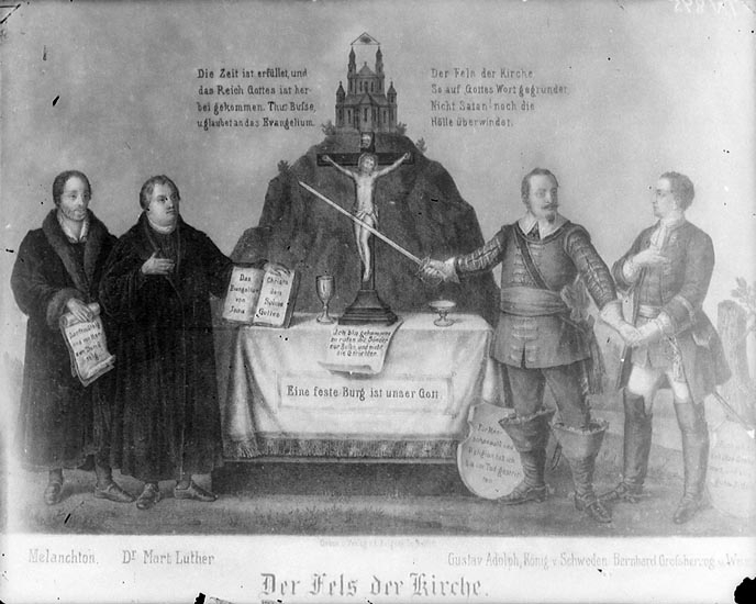 Enligt tidigare noteringar: "Avfotografering av tyskt tryck med bl.a. Martin Luther och Gustaf II Adolf, "Kyrkans Klippa". Trycket har försetts med svensk text."