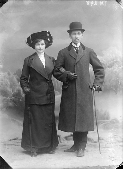 Enligt senare noteringar: "Ateljéfoto av en man och en kvinna klädda i eleganta ytterkläder. Dir. Törner Olsson med fru Lotten, född Houer."