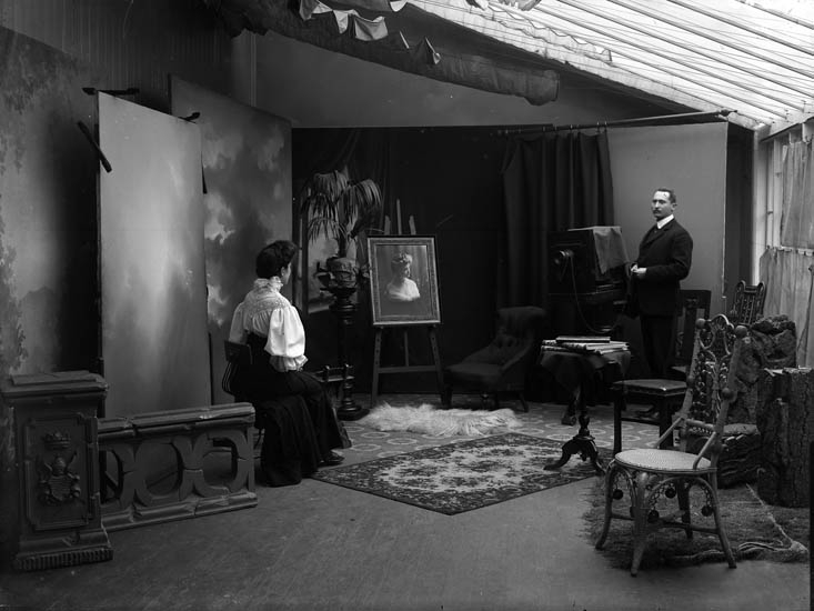 Enligt tidigare noteringar: "Thure Nihlén i arbete i sin atelje vid kameran, fotograferande dam."