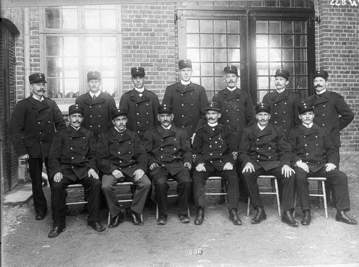 Enligt tidigare noteringar: "Avfotografering av foto av A. Hansson, 1905 föreställande Uddevalla brandkår framför gamla brandstationen vid Torggatan."