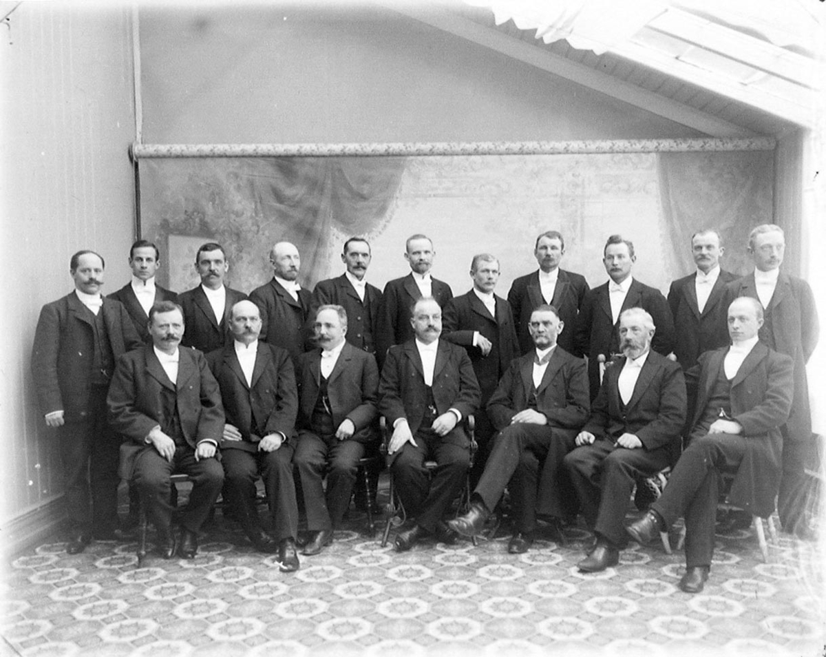 Enligt tidigare noteringar: "Ateljéfoto av 18 st. högtidsklädda män, Nykterhetsloge.Tempelriddare."