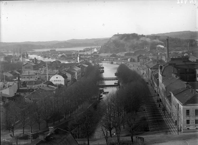 Enligt tidigare noteringar: "Utsikt från Klocktornsberget mot väster, över Bäveån och hamngatorna.