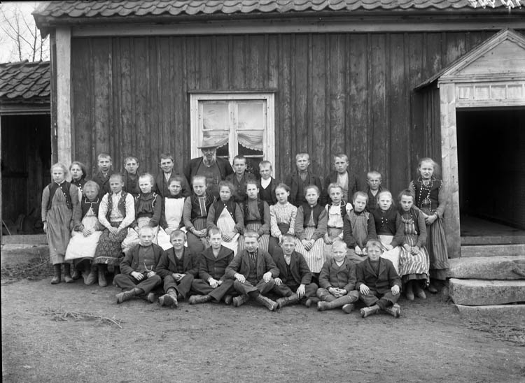 Enligt tidigare noteringar: "Skolklass framför skola. Flickorna i bygdedräkt."